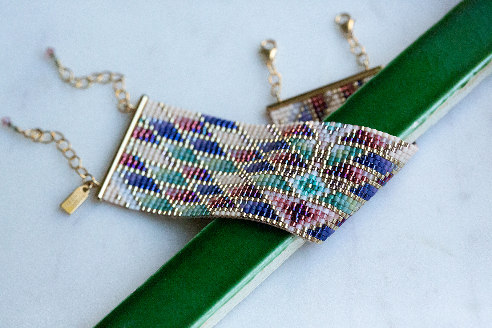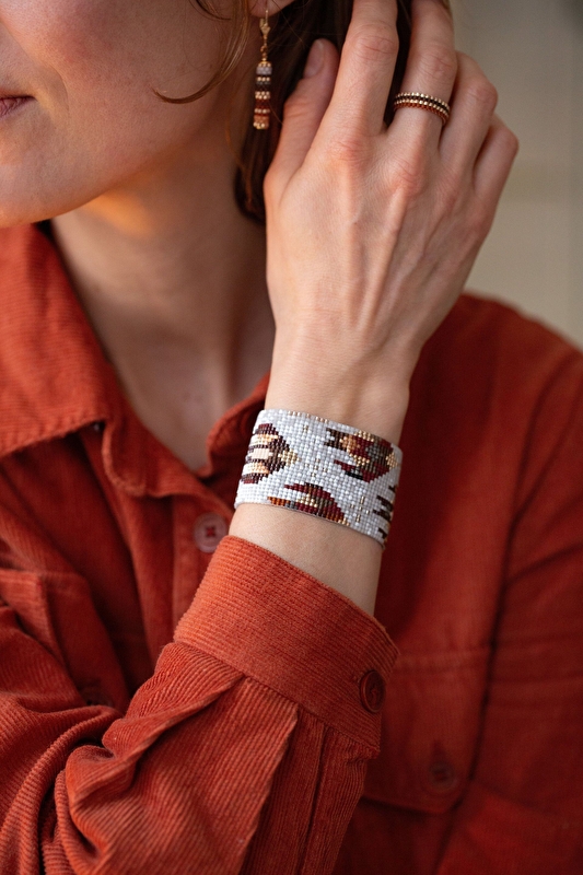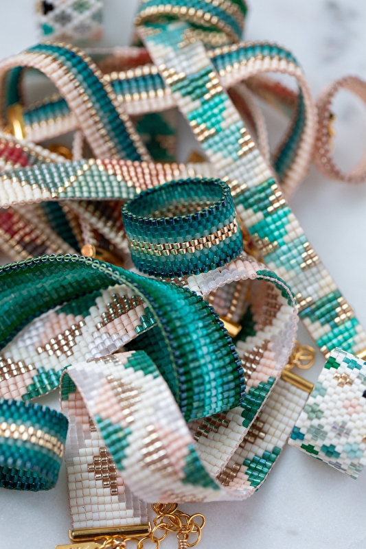 Ses bijoux sont pensés et fabriqués avec une attention particulière pour les matériaux (perles en verre, pierres de gemmes assemblées avec des apprêts plaqués or)