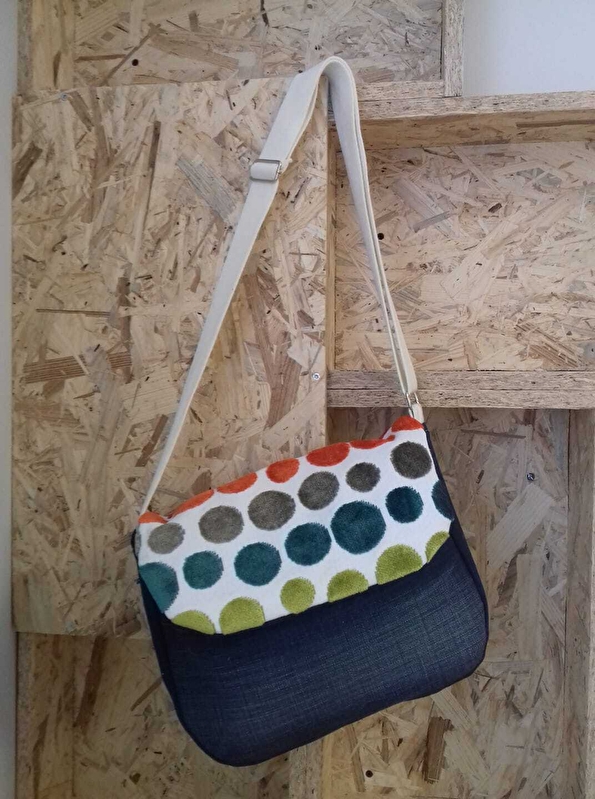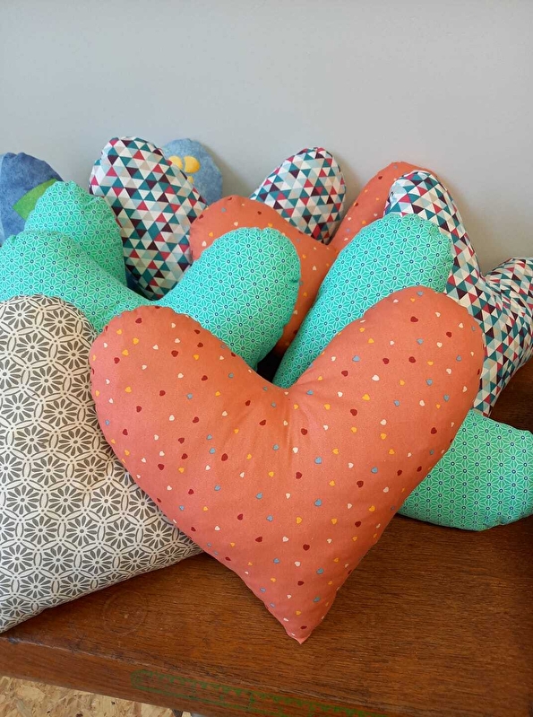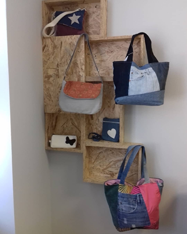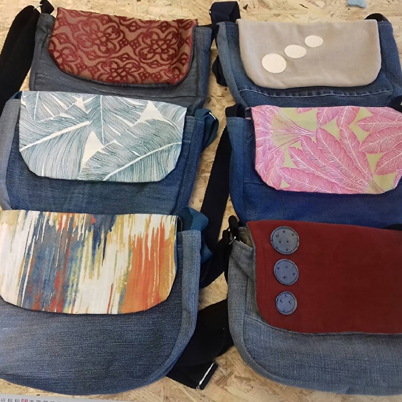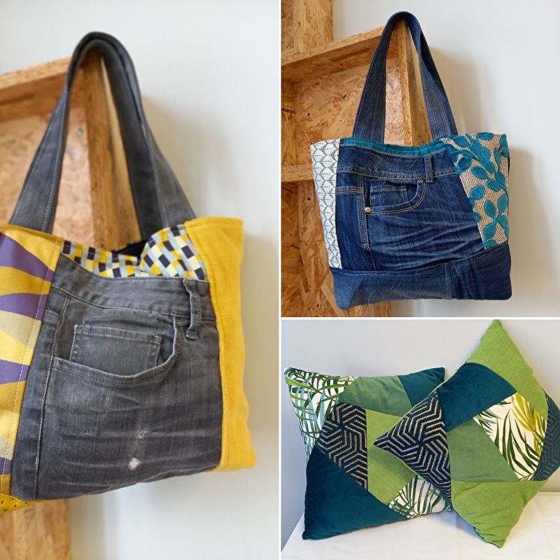 Création d’articles (coussins, trousses, pochettes, sacs de plusieurs modèles) à modèle unique issus de chutes de tissus d’ameublement, de jeans et simili-cuirs dans une optique zéro déchet.